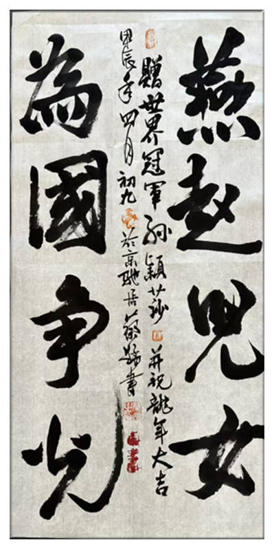 “一球不争,何以征服天下”,这是蔡猛临庄则栋的书法作品。寥寥数字,以乒乓球为载体,传递出竞技体育中对每球必争、每分必拼的态度彰显了追求卓越、以小见大的体育精神格局。亦是对体育人奋进姿态与征服信念的凝练表达。书法艺术在此与体育精神、文化韵味交融,彰显独特的体育文化内涵。